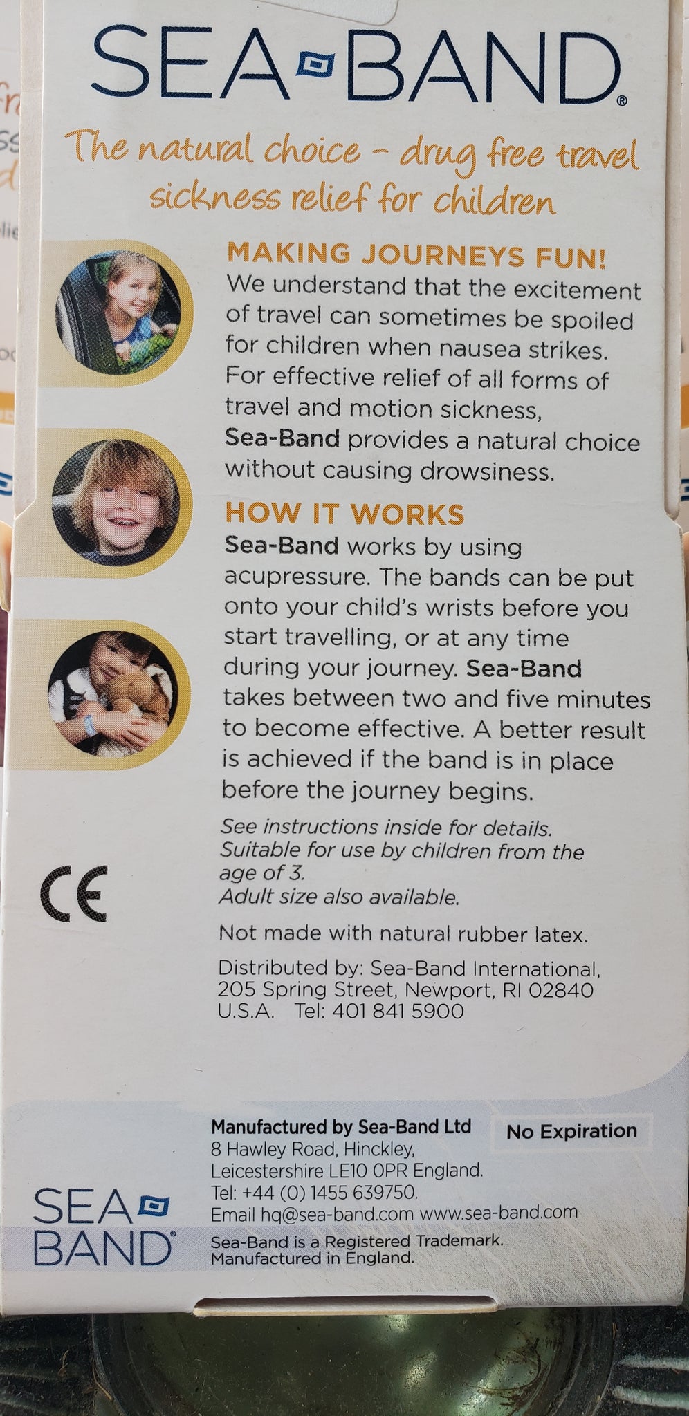 SAFE, EFFECTIVE, REUSABLE, WASHABLE, used by DOCTORS and hospitals a drug-free travel sickness relief for CHILDREN!